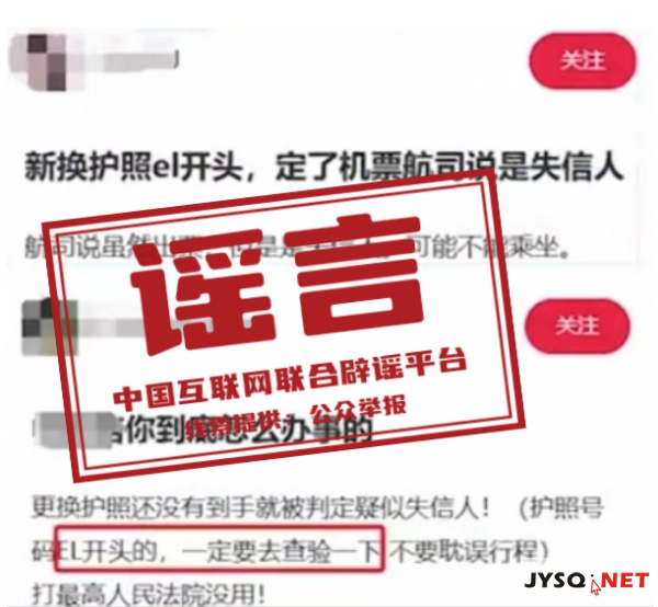 真相:國(guó)家移民管理局回應(yīng)稱(chēng),網(wǎng)傳“護(hù)照號(hào)碼EL開(kāi)頭為失信人員”純屬謠傳。護(hù)照系我國(guó)公民出入國(guó)境和在國(guó)外證明國(guó)籍、身份的證件,普通護(hù)照號(hào)碼共9位,由1位英文字母+8位阿拉伯?dāng)?shù)字按順序組成。2012年我國(guó)啟用電子普通護(hù)照后,首位英文字母由“G”調(diào)整為“E”,代表電子護(hù)照含義。隨著普通護(hù)照簽發(fā)量增加,前綴英文字母調(diào)整為2位,由E+1位英文字母組成,英文字母從A至Z順延,其中字母I、O除外。公安機(jī)關(guān)出入境管理機(jī)構(gòu)審批普通護(hù)照申請(qǐng)后,按順序自動(dòng)匹配空白護(hù)照打印制作。因此,申請(qǐng)人所持護(hù)照號(hào)碼具有隨機(jī)性。 來(lái)源:國(guó)家移民管理局、環(huán)球網(wǎng) |